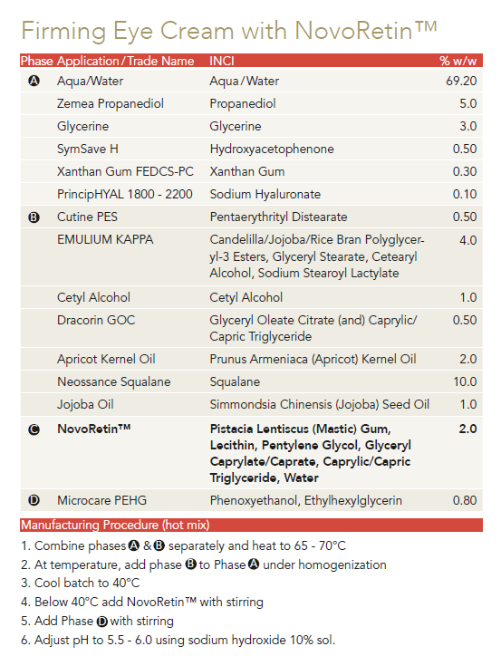 Share icons Facebook Email Twitter Linkedin All news & trends January 09th 2023 Cosmetics Firming Eye Cream with NovoRetin™ - Guide Formulation NovoRetin™ serves as an ideal plant-based retinol alternative, providing both strong anti-aging effects and exceptional benefits for acne-prone skin. Find here the formulation for the Firming Eye Cream with NovoRetin™. Bild Bild Written by Christine Meier